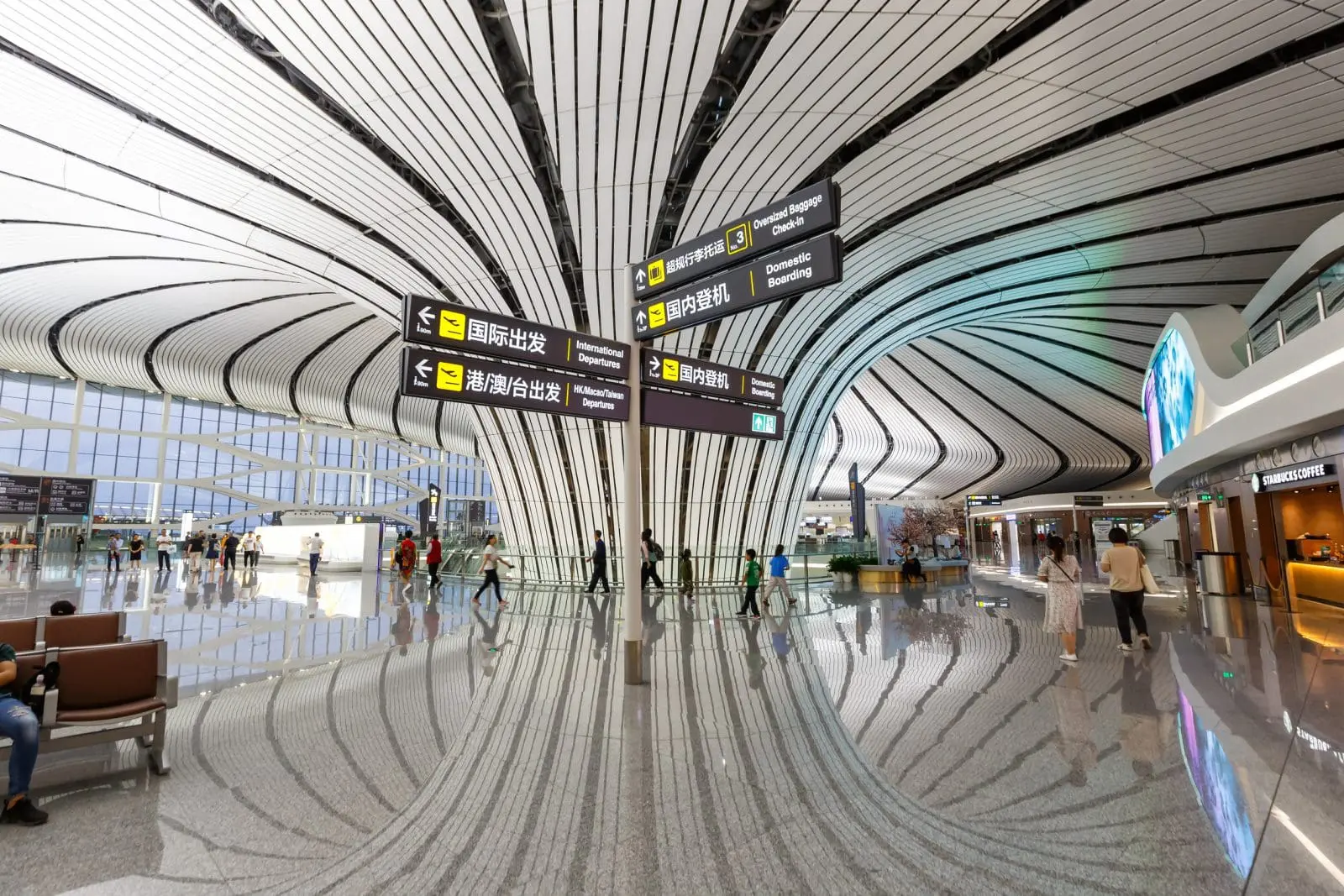 北京大興國際機場(PKX)位於北京市大興區與河北廊坊市交界,距離市中心天安門廣場約 46 公里。這座機場由著名建築師札哈·哈迪德設計,航站樓猶如「鳳凰展翅」,是全球最大的單體航站樓。機場配備自助值機、智慧行李系統,以及高效的交通樞紐,讓旅客一落地就能快速銜接各種交通工具。