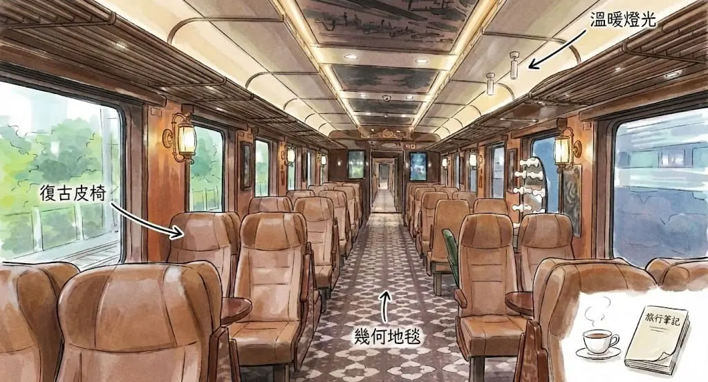 | 7–8 號車廂 | 復古客座車廂 | 延續復古風格,適合拍照、聊天與輕鬆乘坐 |