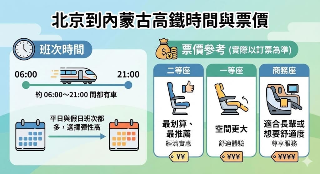 這條路線行駛於 京包/張呼高鐵,班次密集、穩定度高,是目前最成熟的內蒙古高鐵選擇。