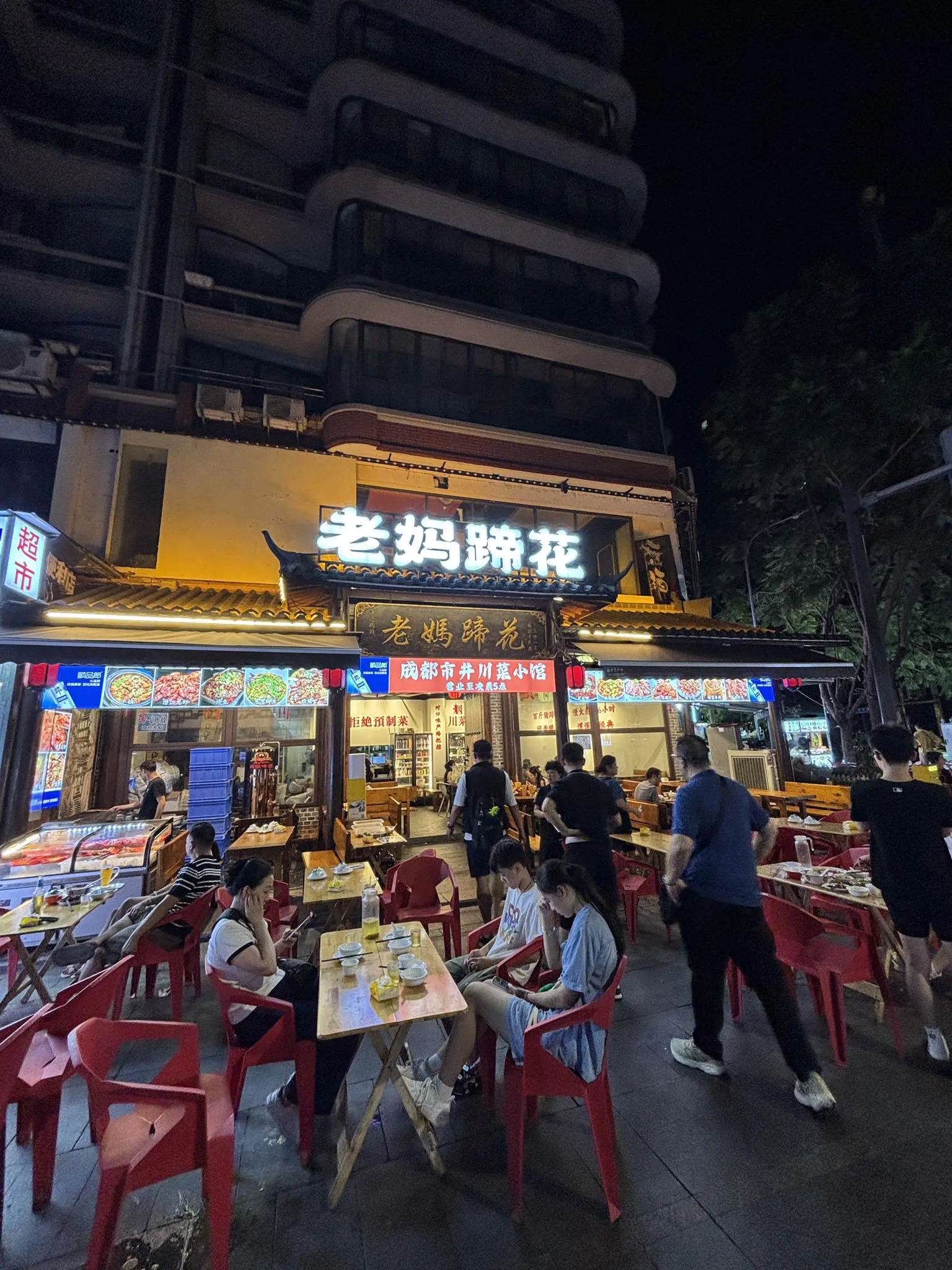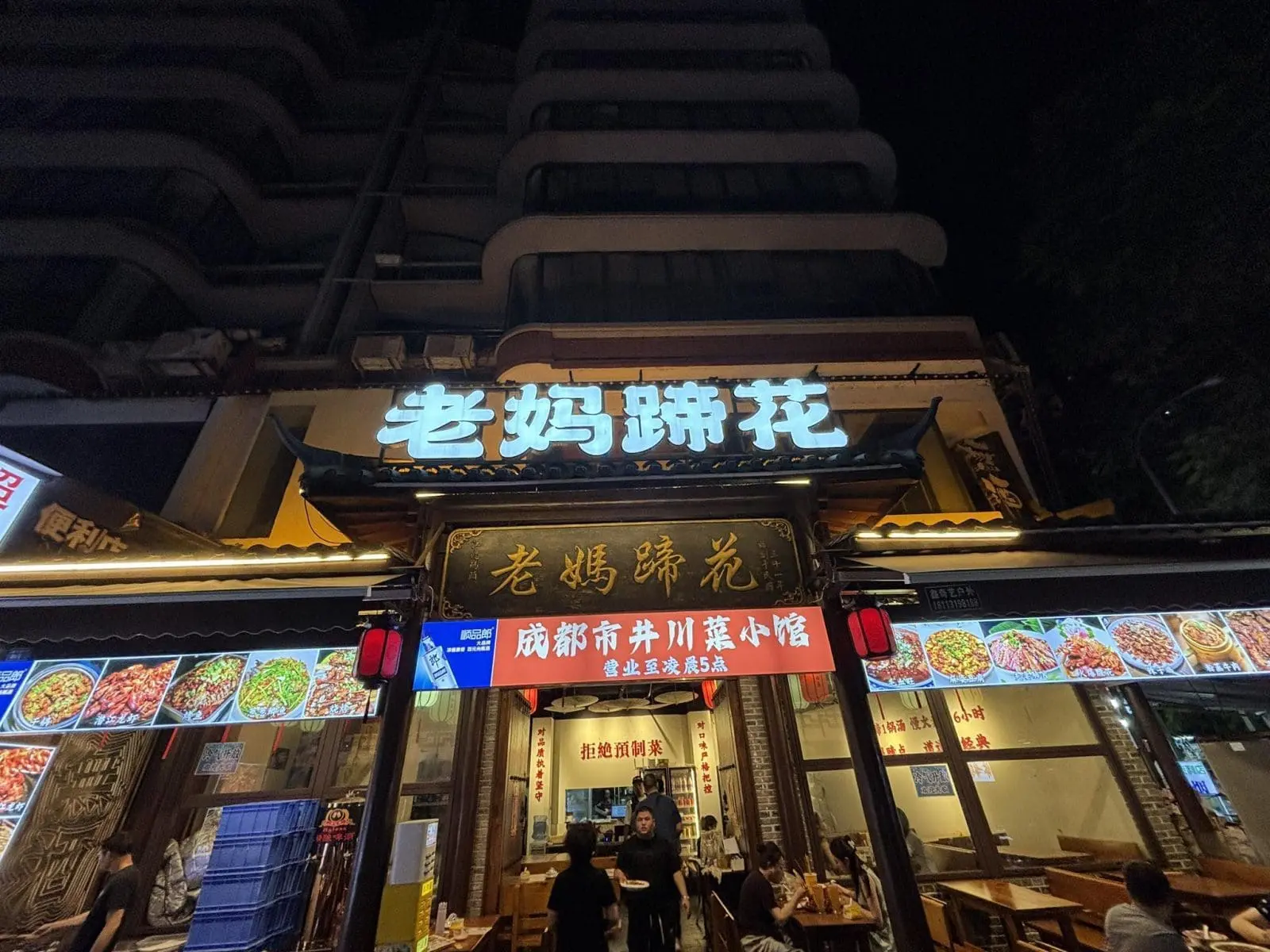 在成都九眼橋附近,夜晚除了酒吧熱鬧,還藏著不少地道美食。像【老媽蹄花】,就是成都人氣宵夜名店之一,主打蹄花湯、川味小吃,湯頭香濃、口感軟爛,深受本地人與遊客喜愛。附近還有串串、豆花飯、冒菜等,適合酒吧前後來一頓暖心夜宵。