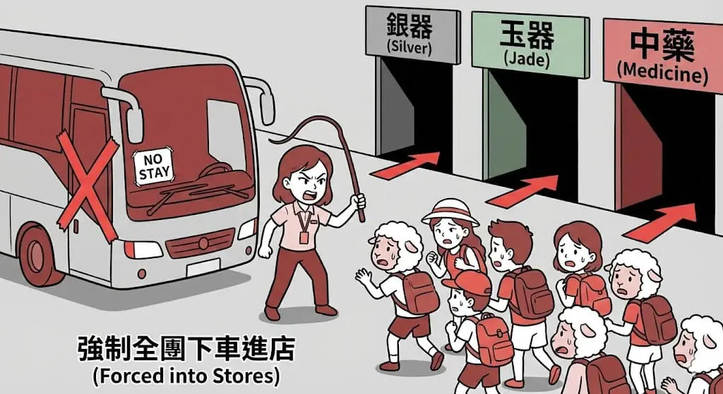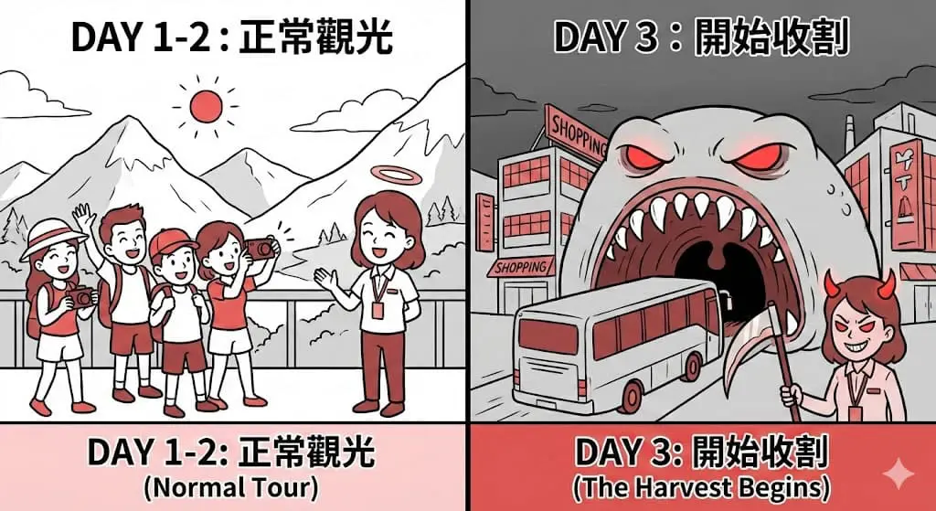 行程前段安排正常觀光,讓旅客放下戒心,從九寨溝返回成都後,購物行程全面失控