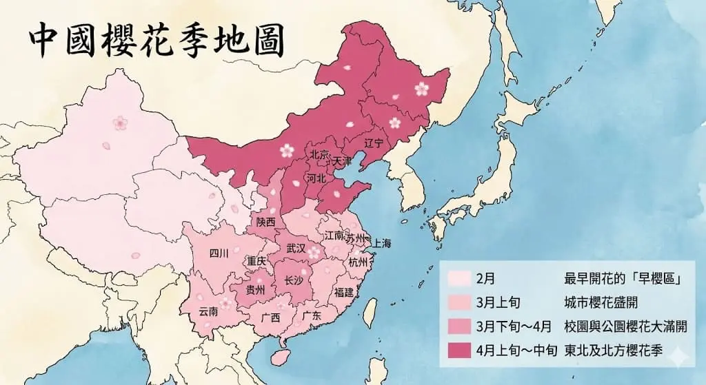 中國大陸幅員遼闊,氣候與緯度差異大,因此櫻花季不像日本只有 3–4 週,而是從 2 月一路綻放到 4 月底。