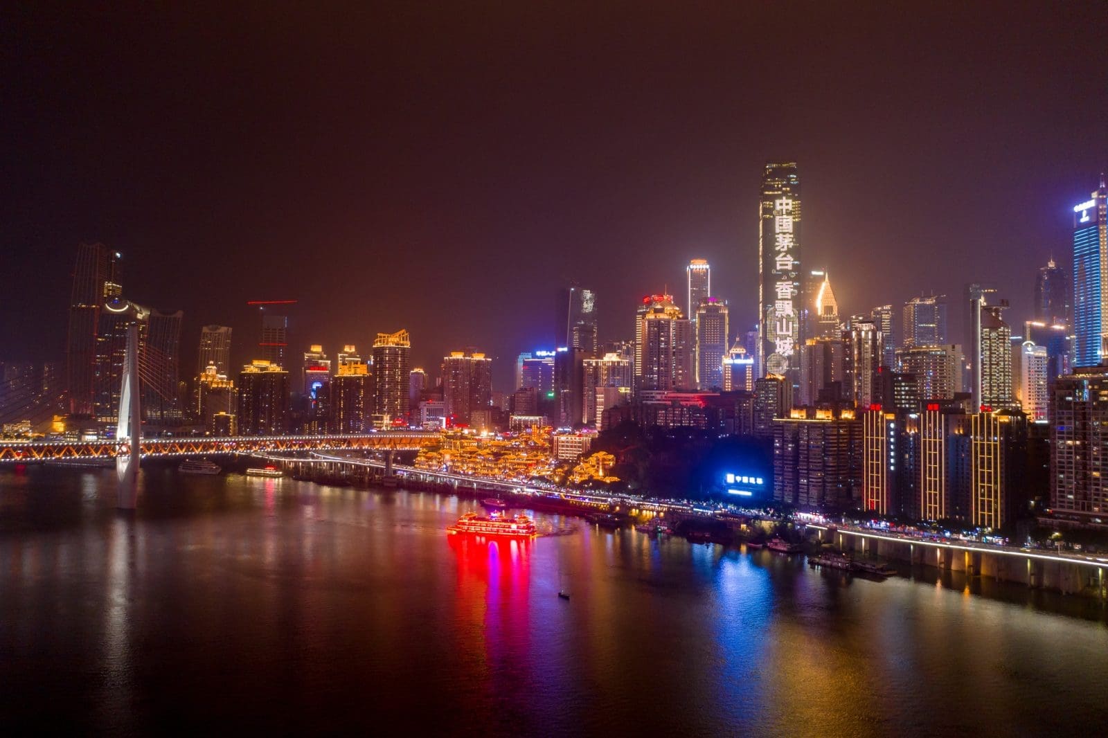 - 甲板右前方:洪崖洞金色夜景與千厮門大橋同框。