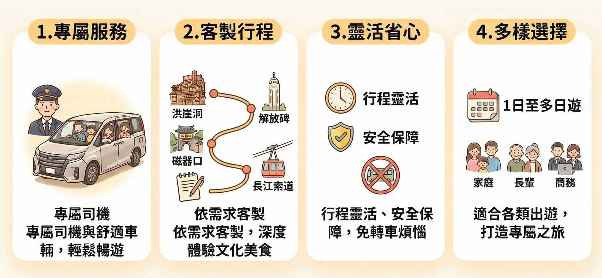 - 行程完全專屬,能依旅客需求彈性調整,真正做到 自由、舒適又安心,讓您只需專注享受旅程。