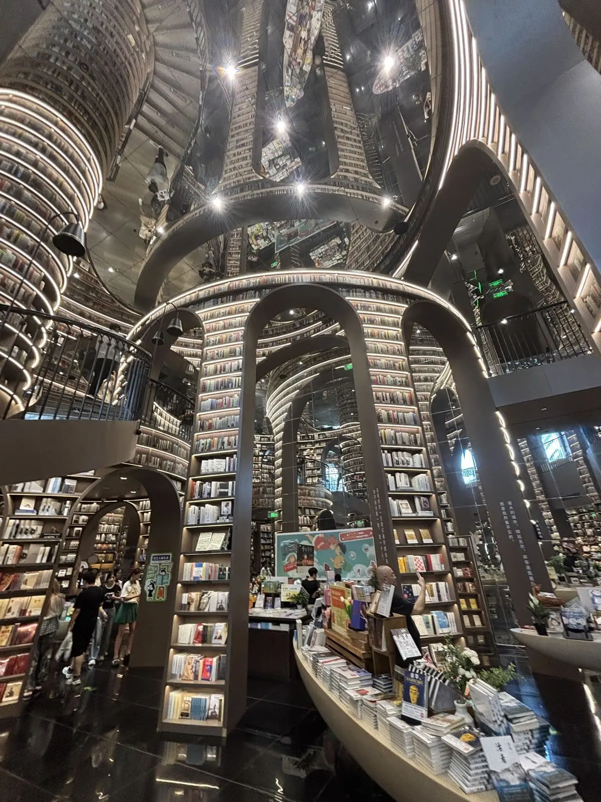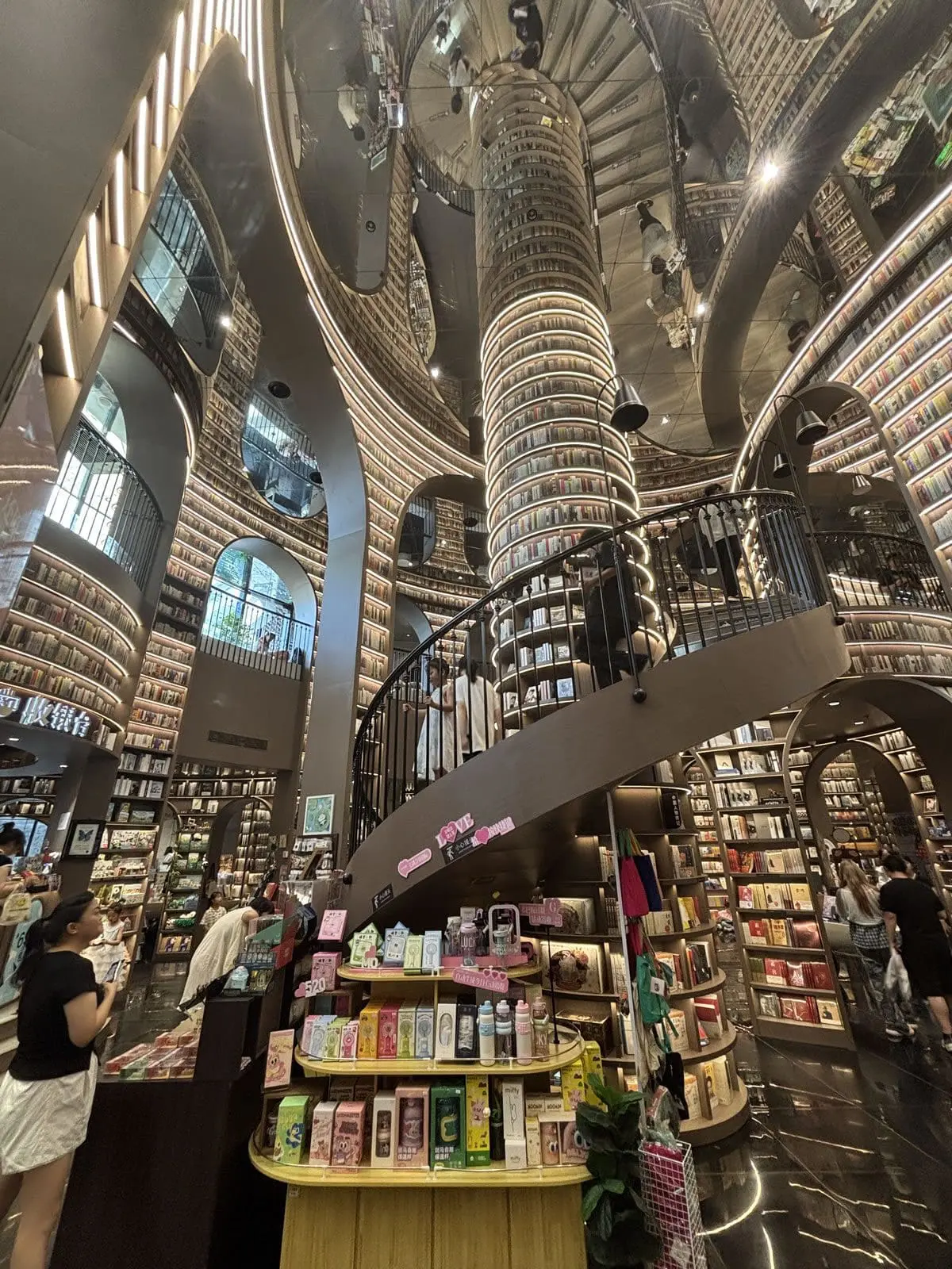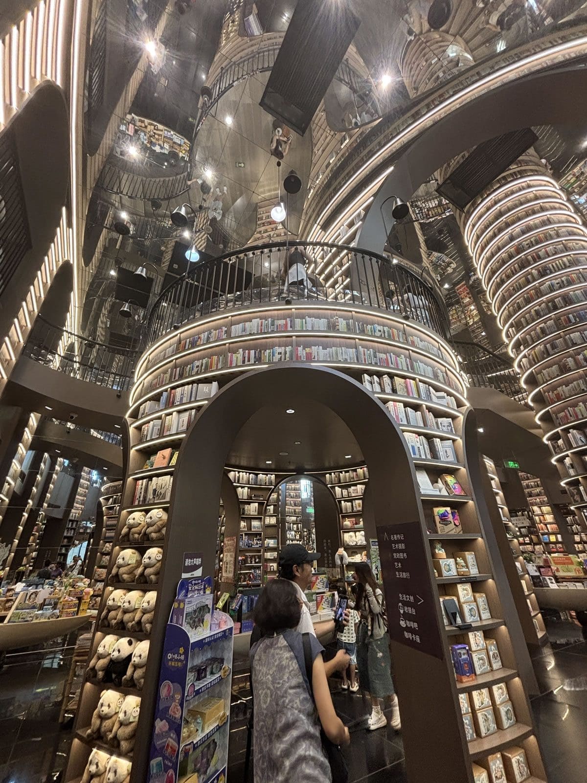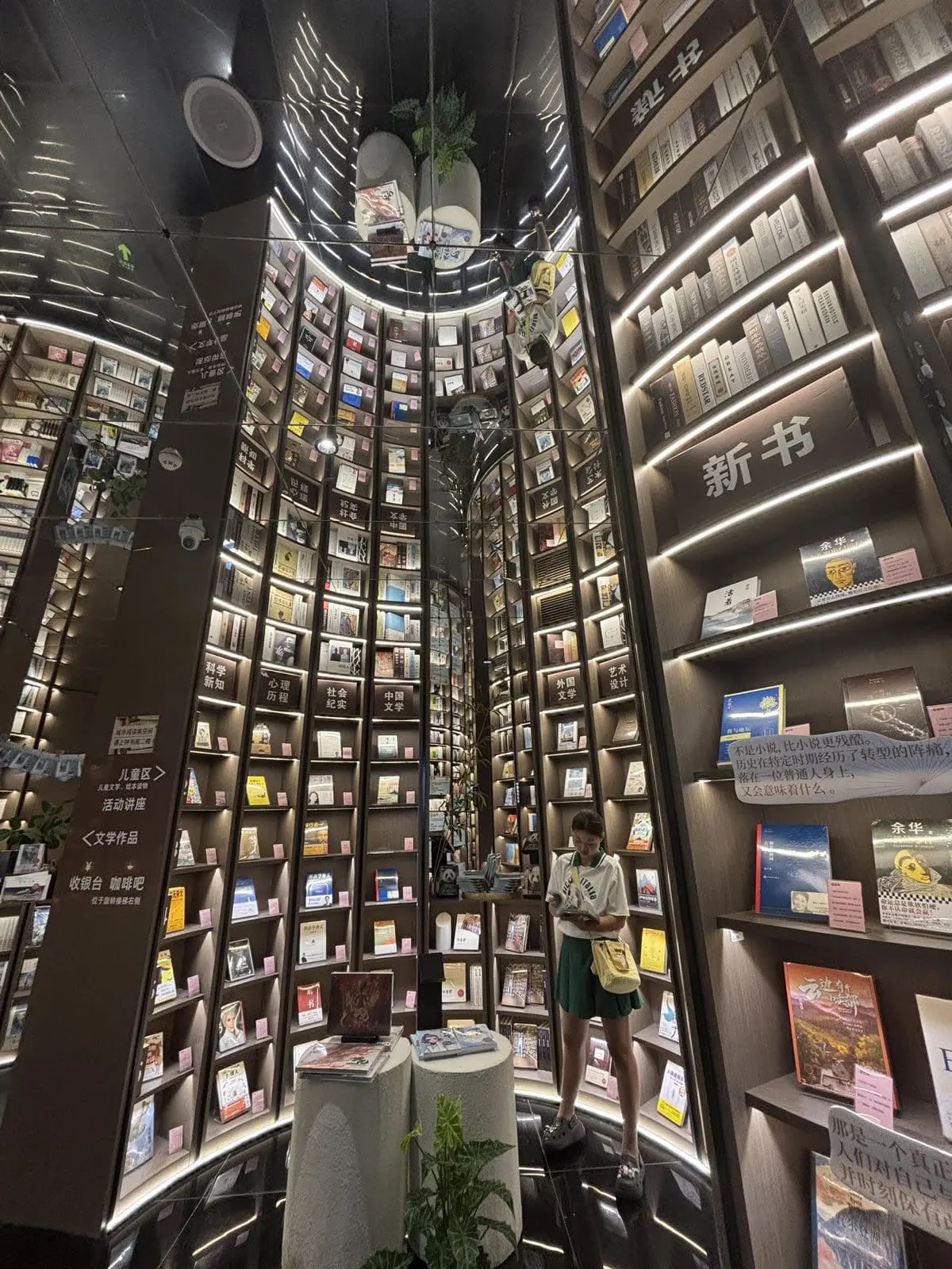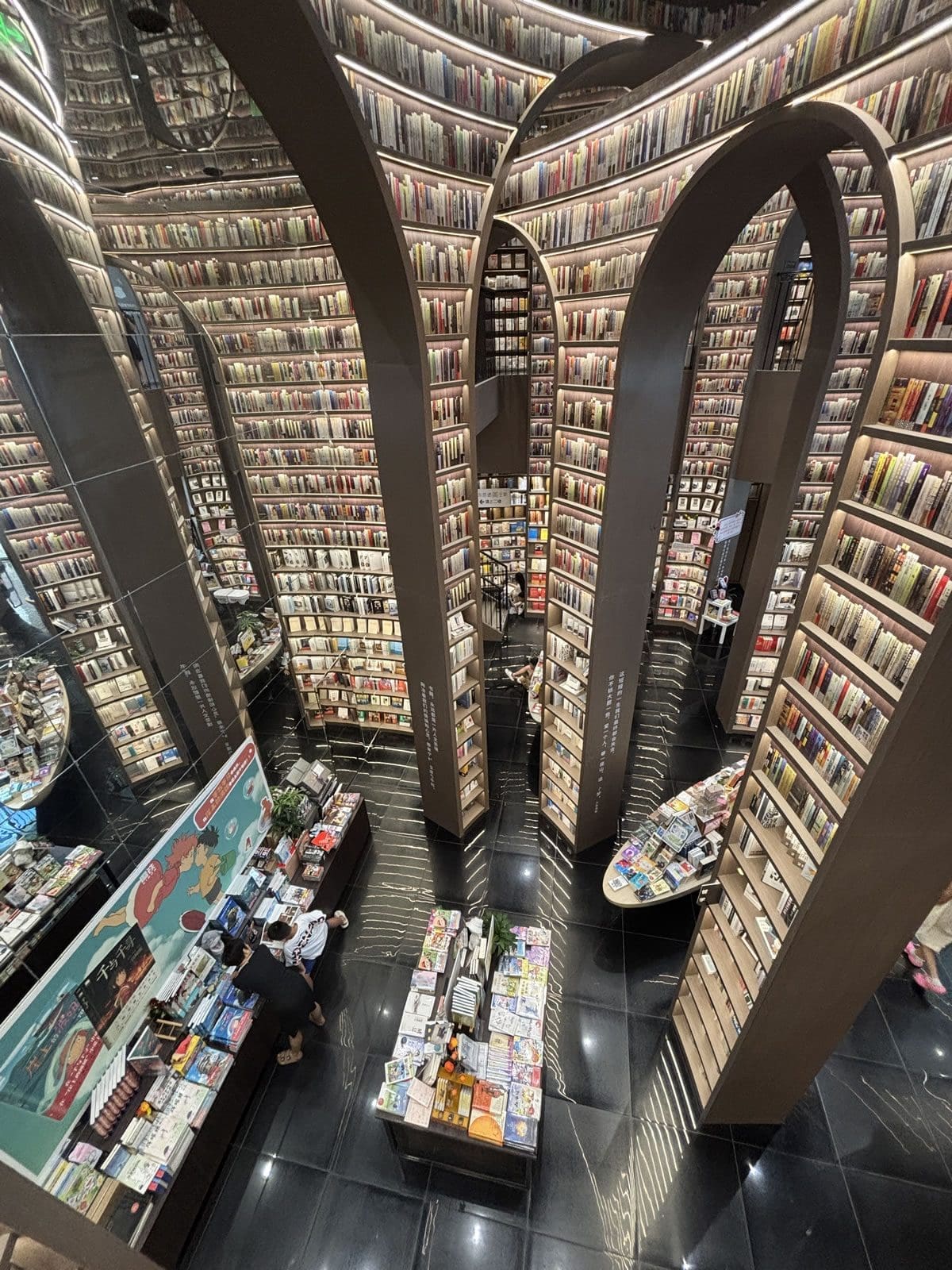 - 鏡面天花與黑色地磚:上下倒映的鏡像效果,讓空間仿佛無限延伸,彷彿步入超現實的「書之長河」。