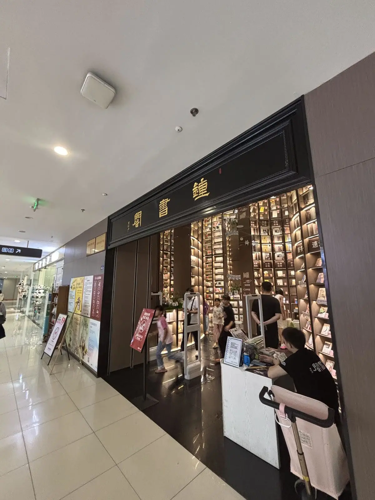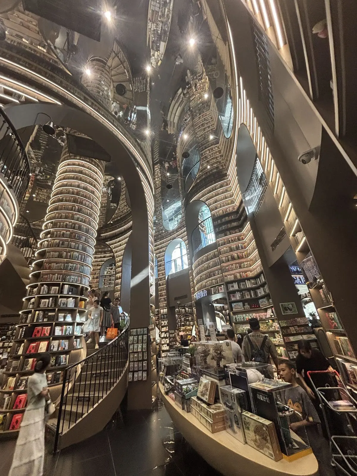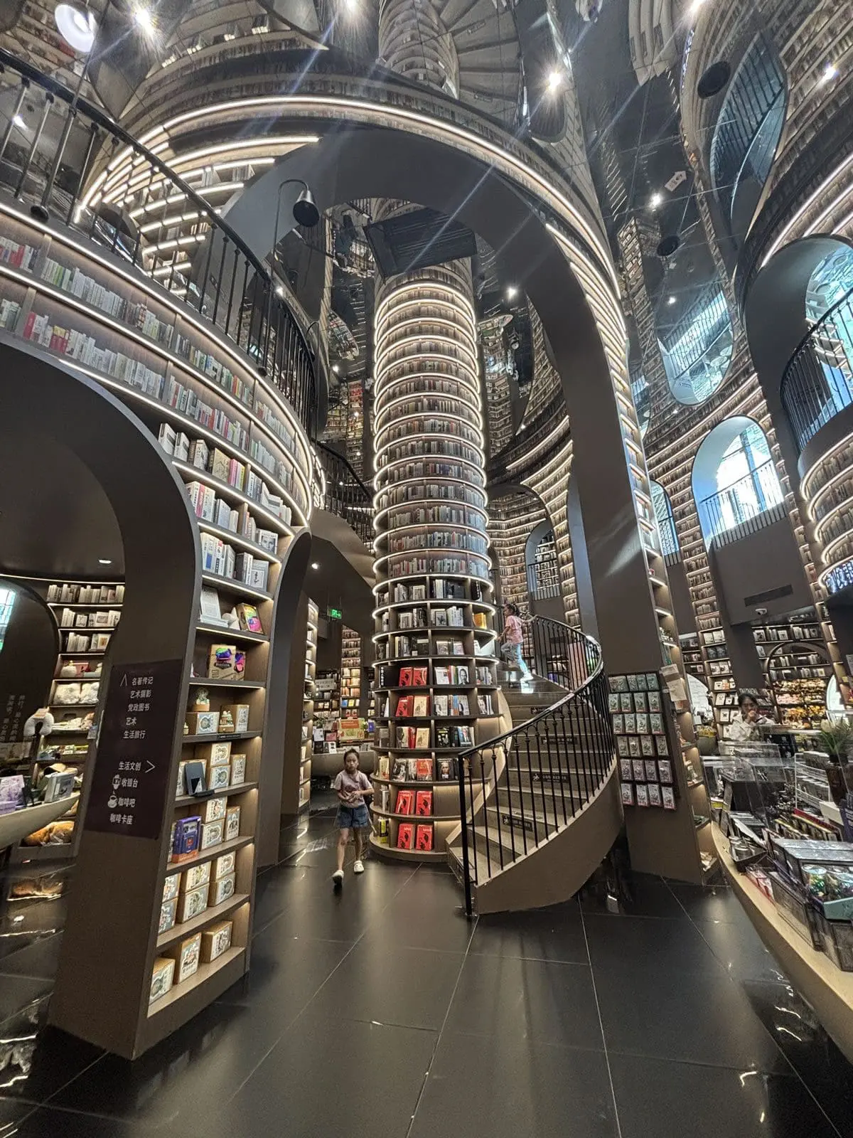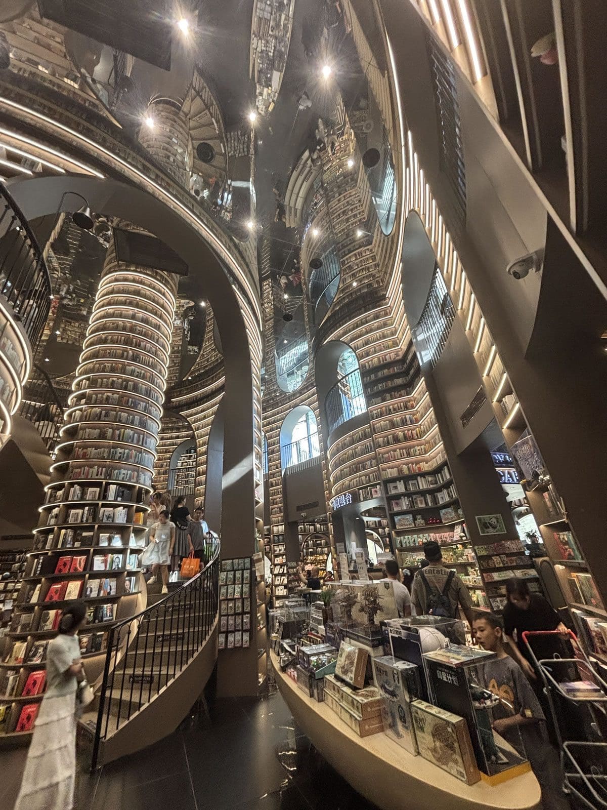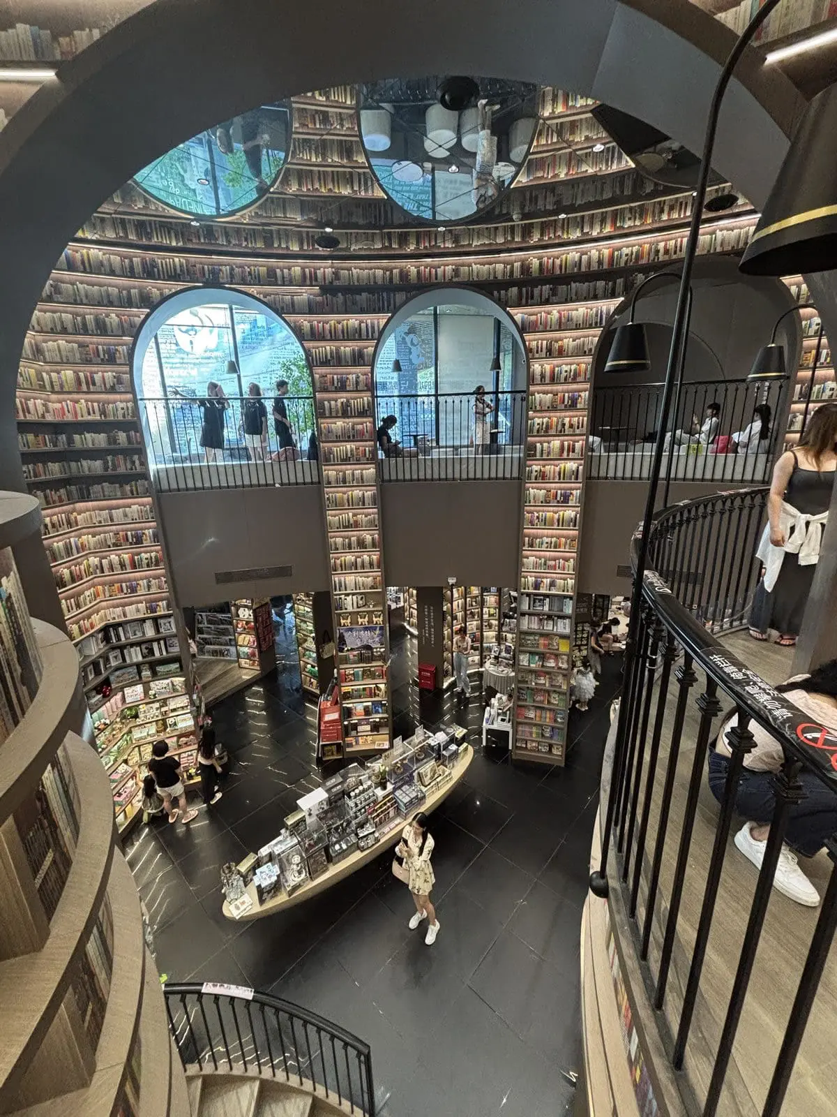 - 鏡面天花與黑色地磚:上下倒映的鏡像效果,讓空間仿佛無限延伸,彷彿步入超現實的「書之長河」。