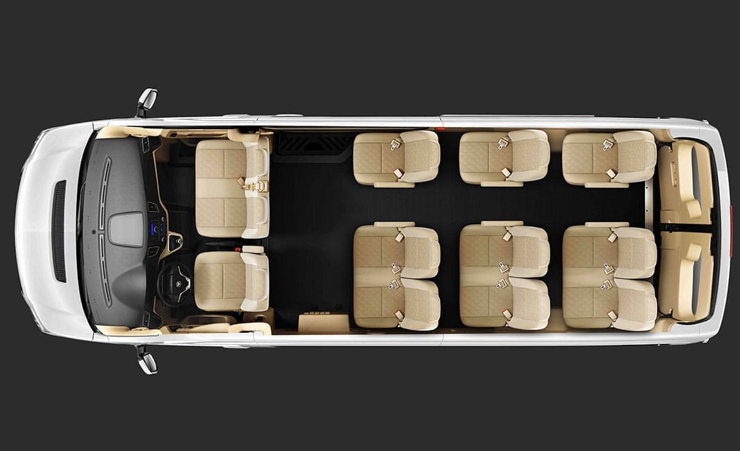 福田·圖雅諾屬於9座商旅車,標準座位配置為:前排 1名司機+1名副駕,後排共3排座椅,最多可乘坐7位乘客但考量行李空間、乘坐舒適度與長途旅遊需求,實際建議乘坐人數為6人,可預留空間放置大型行李箱,避免擁擠。座椅設計偏高,腿部空間寬敞,適合長途行駛與年長者乘坐,也方便上下車。