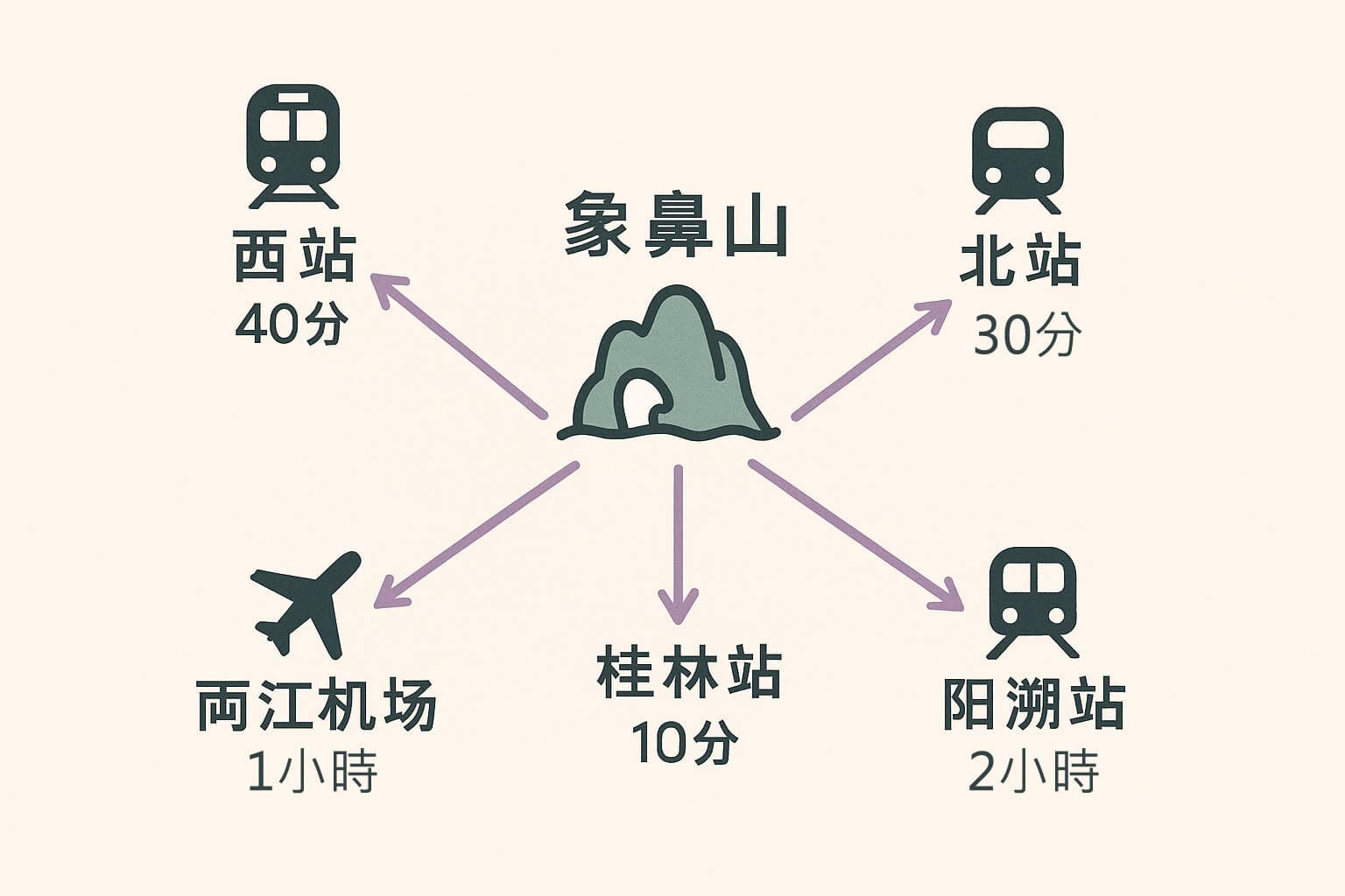 - 桂林兩江機場距離象鼻山約 30 公里,路況良好,但高峰期容易塞車。建議提早出發。