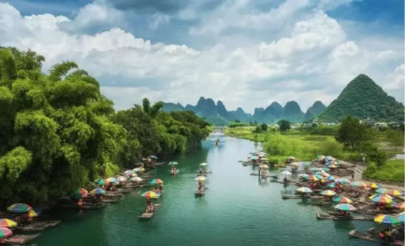 遇龍河是漓江最美支流,竹筏漂流沿途可見青山疊翠、稻田村落,安靜自然。雙人竹筏更適合情侶與小團體,體驗“人在畫中游”的愜意。