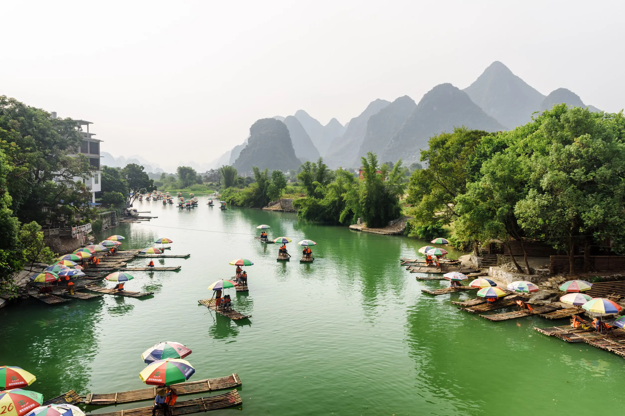被譽為「小漓江」,以清澈碧水與田園風光聞名。多人竹筏航段適合家庭與朋友同遊,河面平緩安全,可近距離觀賞翠綠山巒與鄉村田園,是陽朔最受歡迎的休閒體驗。