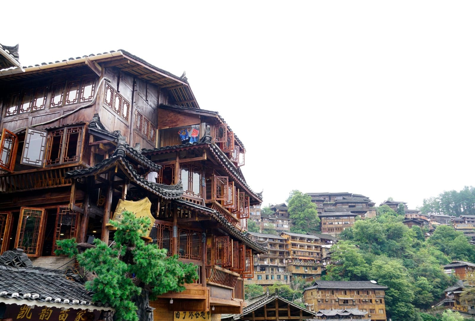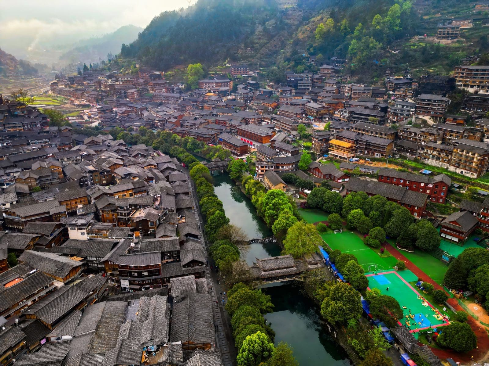 整座苗寨層層堆疊在山坡上,俯瞰時像一幅巨大的木色梯田,非常震撼。