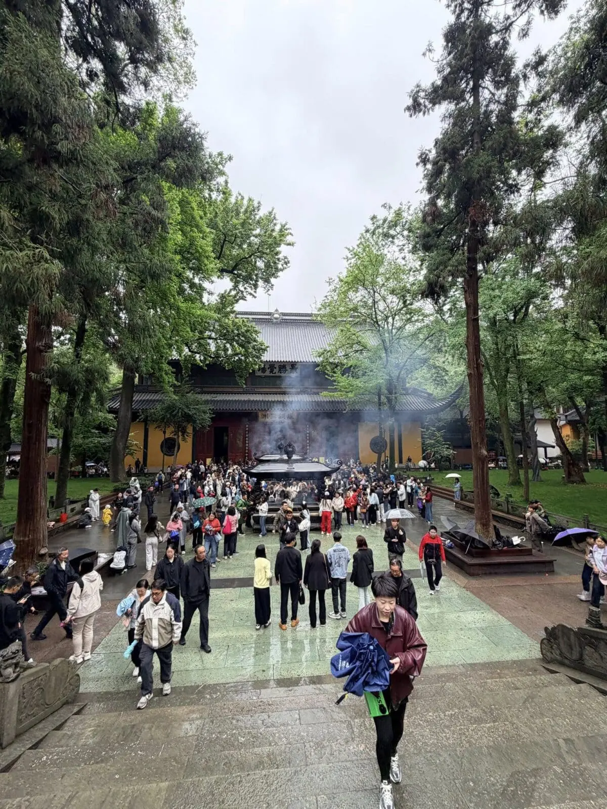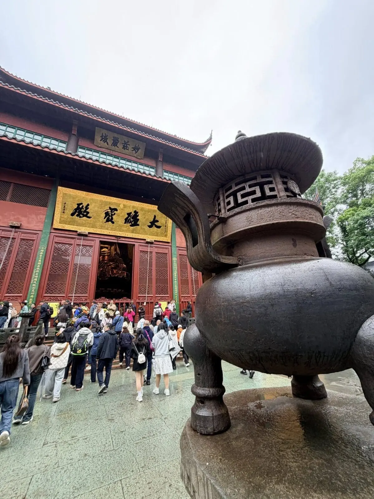 靈隱寺座落於群山環抱之中,古木參天、香火鼎盛,從走進山門的那一刻起,就能感受到與西湖周邊截然不同的靜謐氣息。尤其碰上微雨天,石板地、古樹、香煙與殿宇交織出的畫面,更有一種深山古寺的沉靜與莊嚴。