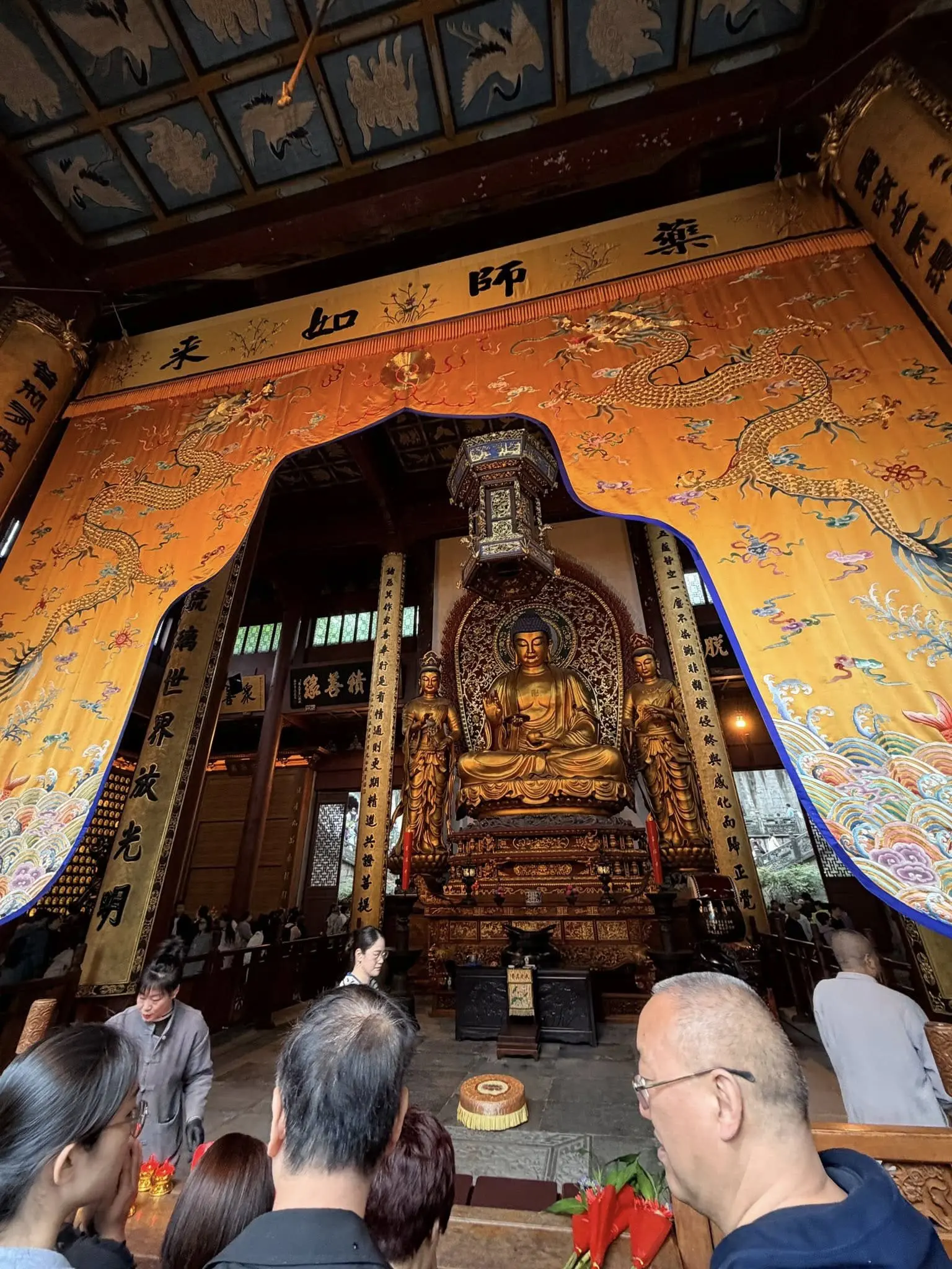 靈隱寺的殿宇規模相當可觀,外觀色彩沉穩厚重,搭配巨大的匾額、木門與屋簷線條,整體氣勢非常莊嚴。站在殿前抬頭看,不難感受到千年古剎所帶來的歷史厚度,也難怪這裡一直是杭州佛教文化的重要象徵。