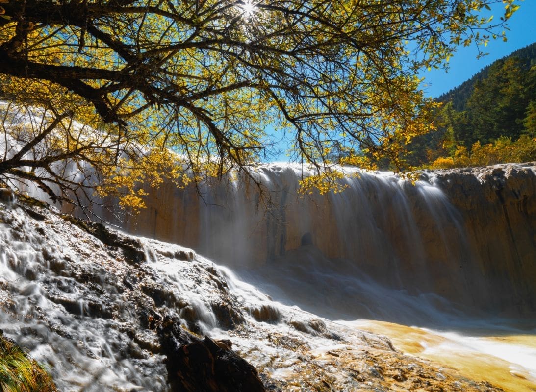 飛瀑流輝是一組由鈣化台地與泉水匯聚而成的天然瀑布群。清澈的溪水沿著黃白色鈣華坡面傾瀉而下,形成層層疊疊的水幕,陽光照射下閃爍著晶瑩光芒。夏秋季節水量最為充沛,氣勢磅礴;而在冬季,部分水流凝結成冰掛,呈現夢幻水晶世界。飛瀑流輝展現了黃龍景觀中「動與靜」的完美結合。