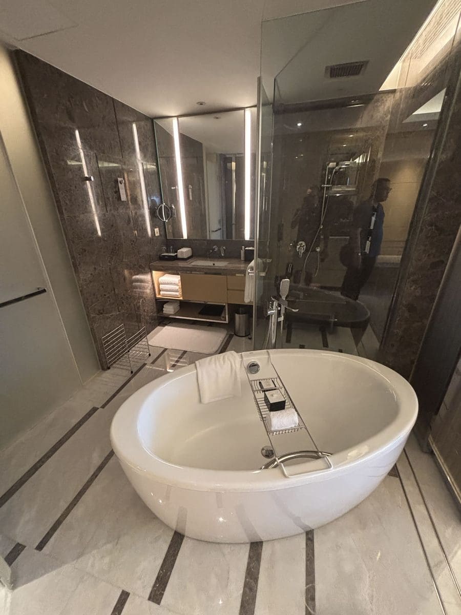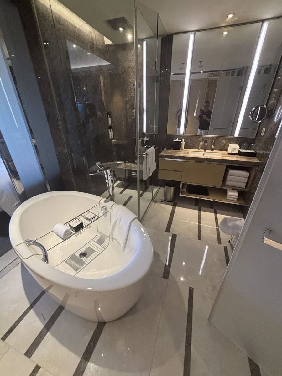 - 大理石浴室裡有獨立浴缸+淋浴間,洗澡完還有加熱毛巾架,細節很到位。