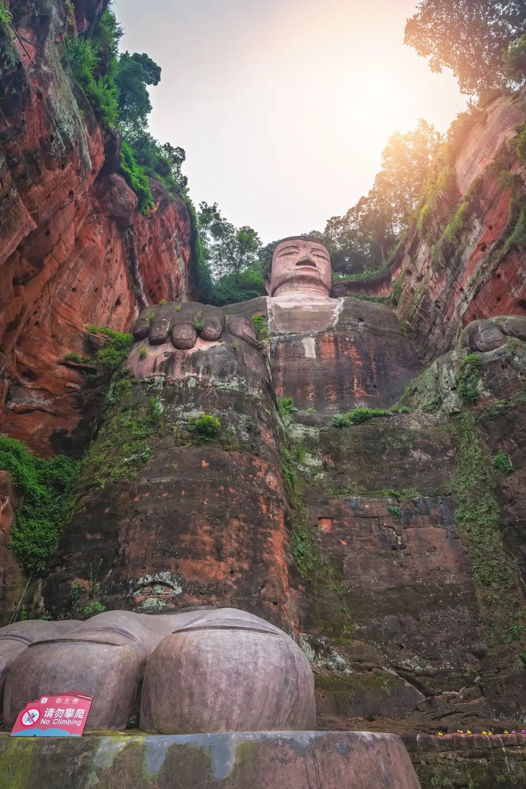 下行途中,可從不同角度欣賞大佛的雄偉身軀與懸崖石刻。到達佛腳區後,這裡是仰拍大佛全景的最佳位置,也別忘了借位“抱佛腳”,寓意好運相隨。