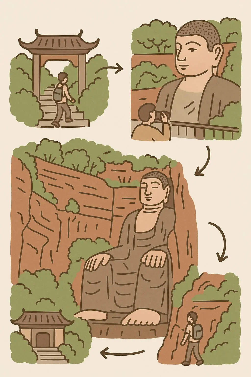| 上山 & 佛頭區 | 北門檢票→石階→龍湫、載酒亭→佛頭平台 | 約40-60分鐘 | 俯瞰大佛髮髻(1051個)、大耳朵 |
