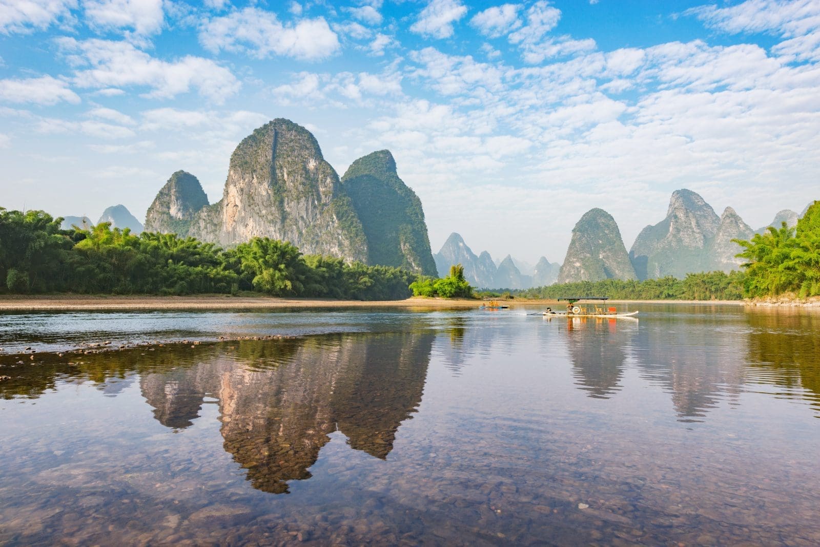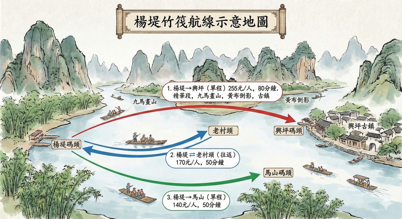 說到桂林陽朔,最不能錯過的就是「漓江竹筏」。其中公認最美、最值得一生一次的路段,就是 楊堤(Yangdi)→ 興坪(Xingping)。