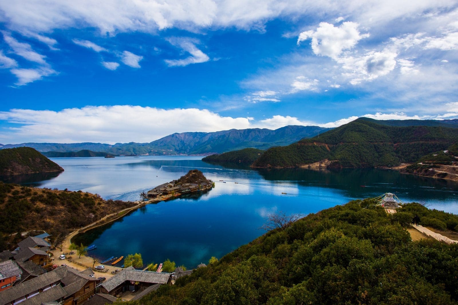 俯瞰碧波粼粼的湖水,宛如藍綢鑲嵌山間。湖面漣漪間,流傳著摩梭女兒國的傳說,是觀景拍照的必到之地。
