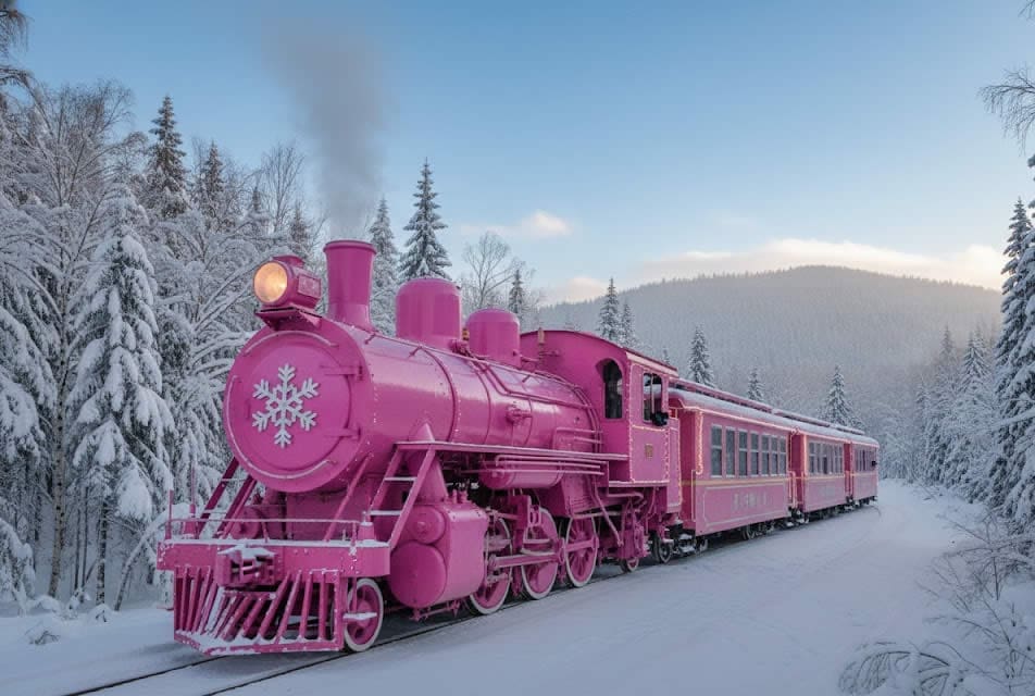 爆紅網紅打卡列車,穿行於白樺林與雪原之間。柔和粉色車身與純白雪景形成夢幻對比,是拍攝雪國童話氛圍感照片的最佳場景。