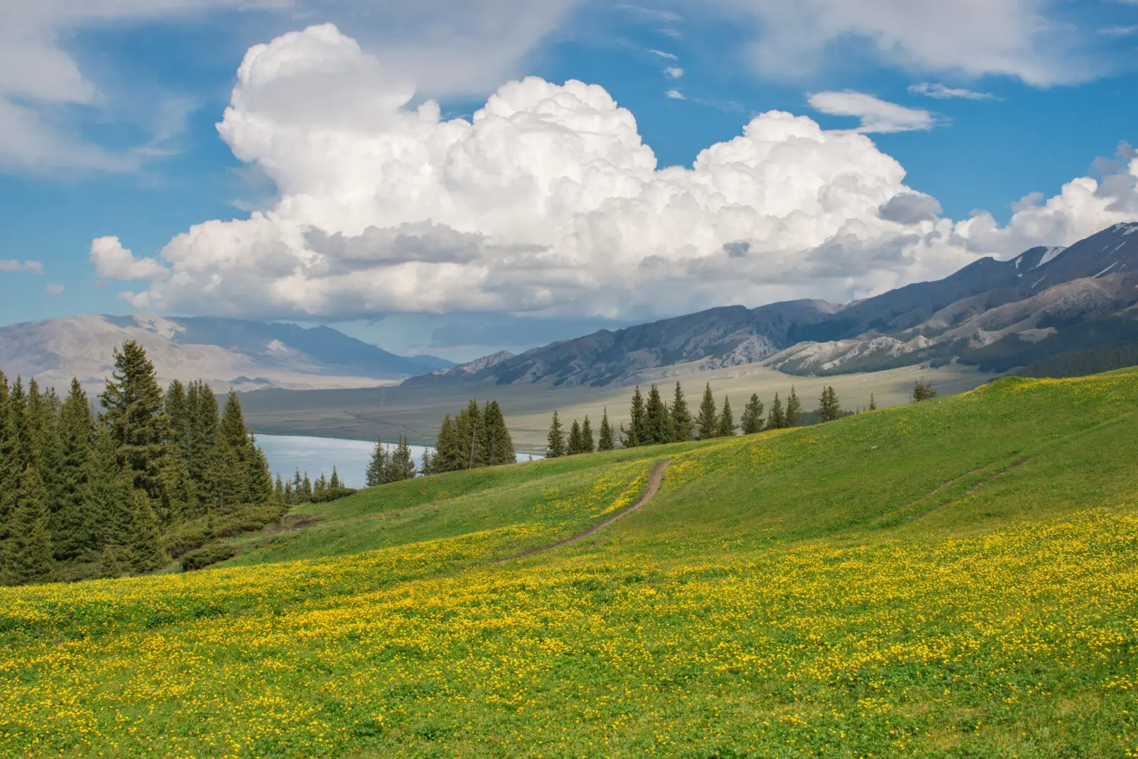 金花紫卉是賽里木湖非常受歡迎的拍照地點。花季時,整片草原會開滿金黃色的小花,與藍色湖水形成強烈對比,非常上鏡。