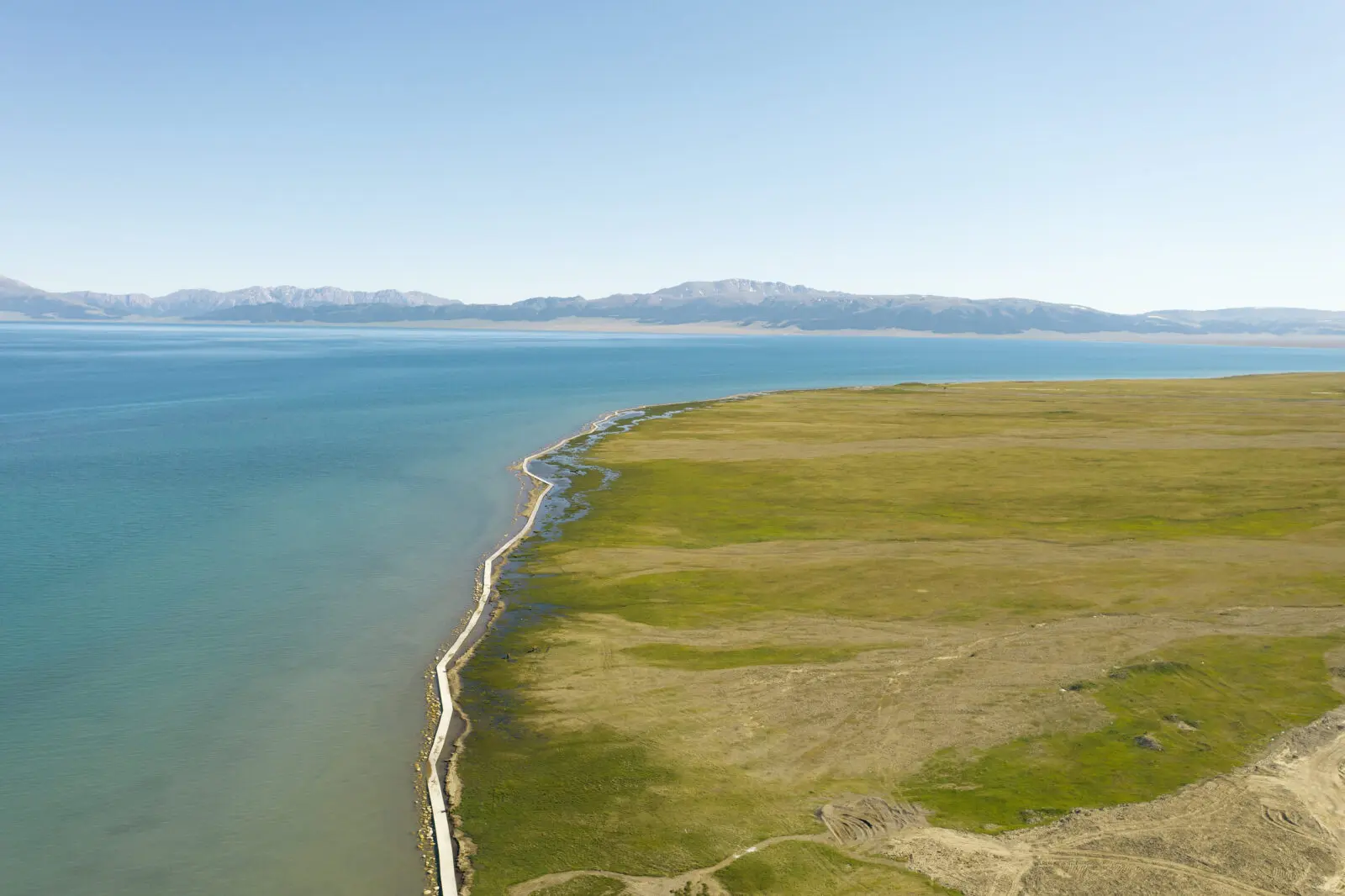 月亮灣是賽里木湖非常經典的觀景點之一,湖岸呈現彎月形狀,因此得名。湖水在陽光照射下會呈現不同層次的藍色,搭配遠方雪山與草原景色,非常壯觀。