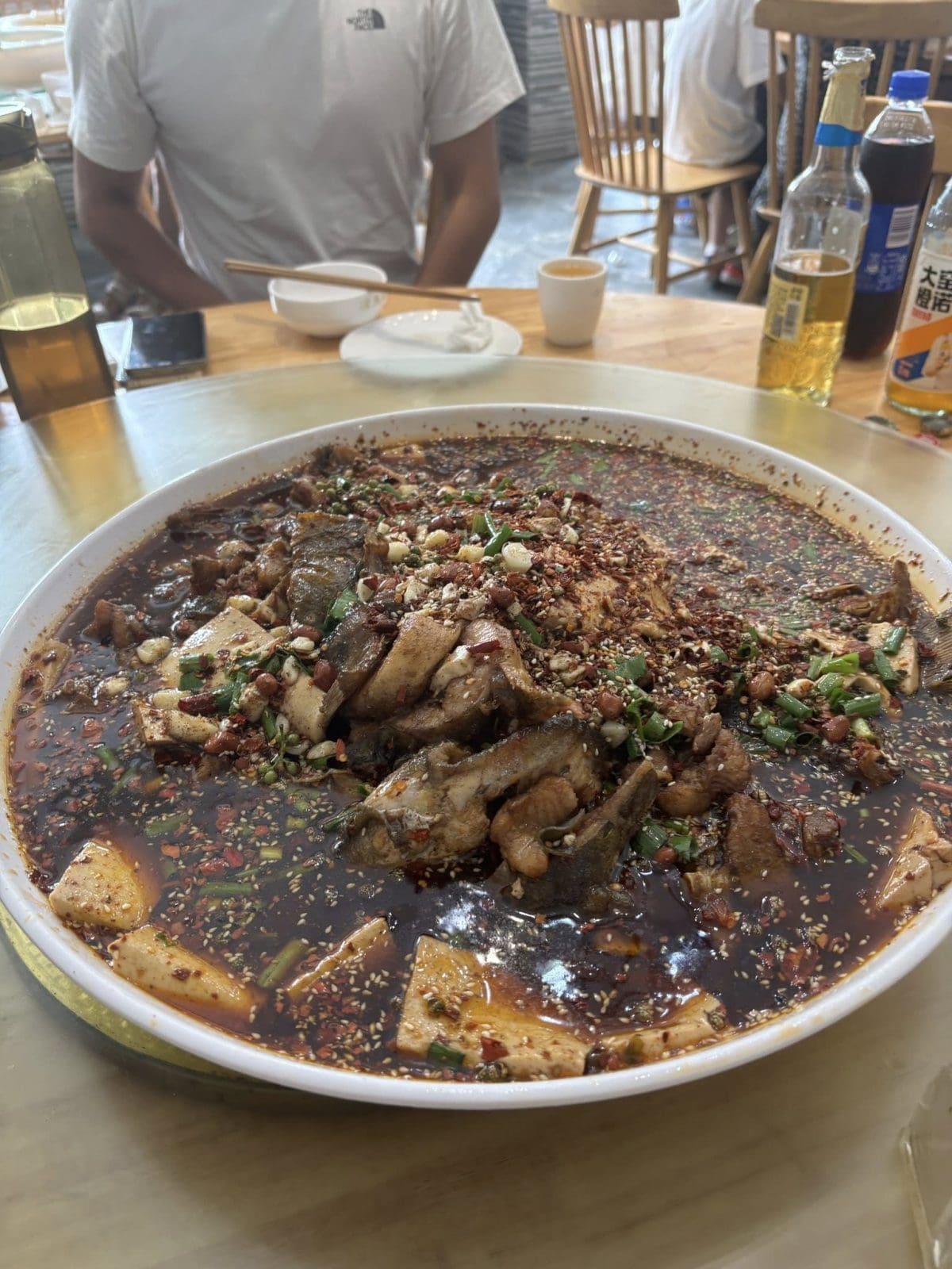 這一大盆,就是傳說中的三溪口豆腐魚!色澤紅亮、香氣撲鼻,裡頭是現炸的花鰱魚塊、嫩豆腐、花生碎、泡椒、蔥花與滿滿的麻辣湯底。魚肉酥嫩細膩、豆腐吸飽辣香,搭配米飯根本停不下來!