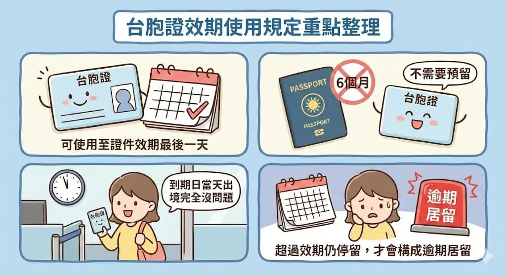 只要行程結束日早於或等於證件到期日,就可以正常入境,無須重辦。