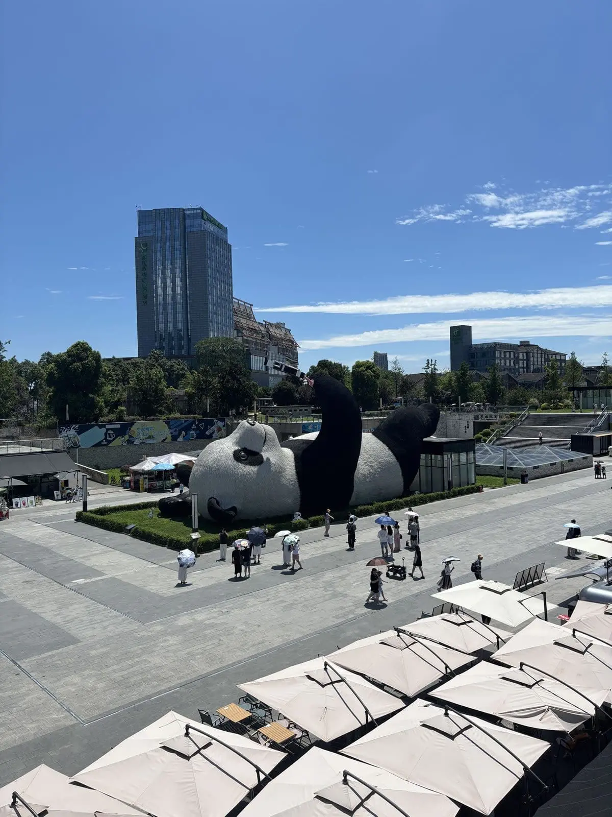 這隻熊貓長 26 公尺、寬 12 公尺、高 11 公尺,圓滾滾地躺在草坪上,翹著腿舉自拍棒,呆萌又安逸,簡直是「成都生活態度」的最佳寫照。