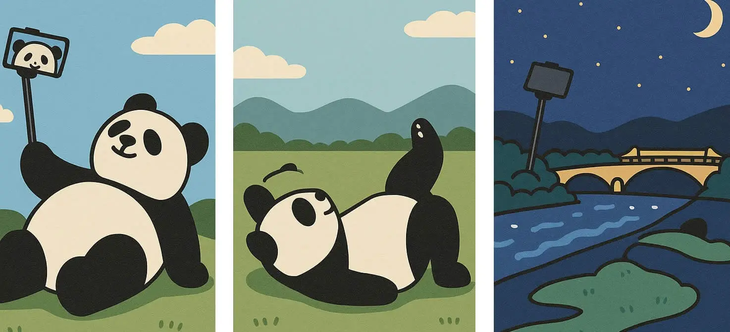 | 側面躺平 | 模仿熊貓慵懶姿勢跷腳仰臥 | 以青山藍天為背景,秒變「躺平藝術家」 |