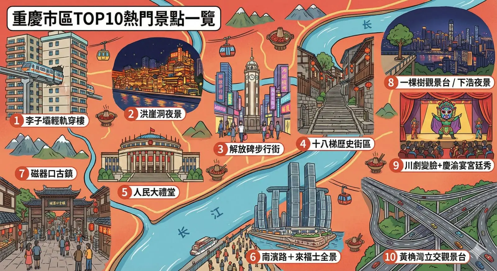 身為在地重慶包車導遊,我整理出「重慶市區必去 TOP10 景點」,從經典打卡地標、最震撼的江景夜色,到在地人也愛逛的老街與美食集中地,一次幫你排好。就算是第一次到重慶,也能輕鬆看懂、拍好拍滿、不走冤枉路,把重慶最精華的魔幻魅力完整帶回家。