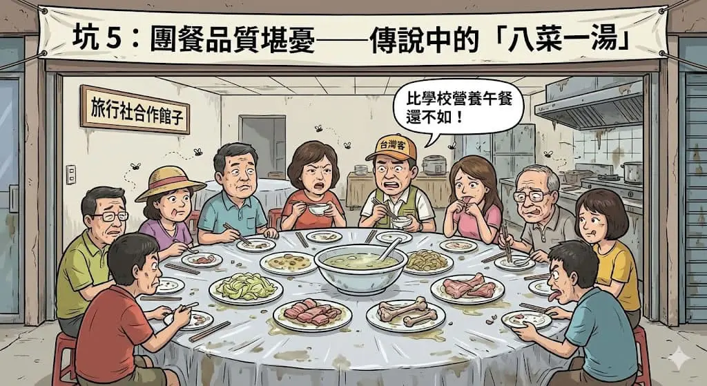 低價陷阱、趕行程、購物店太多、自費綁行程、團餐品質差、住宿老舊偏遠、景點外觀代替入內、導遊變推銷員、合約模糊、團友素質不一。