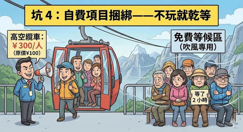 許多團的重點景點故意列為自費,例如:秀場、纜車、觀景車等等。