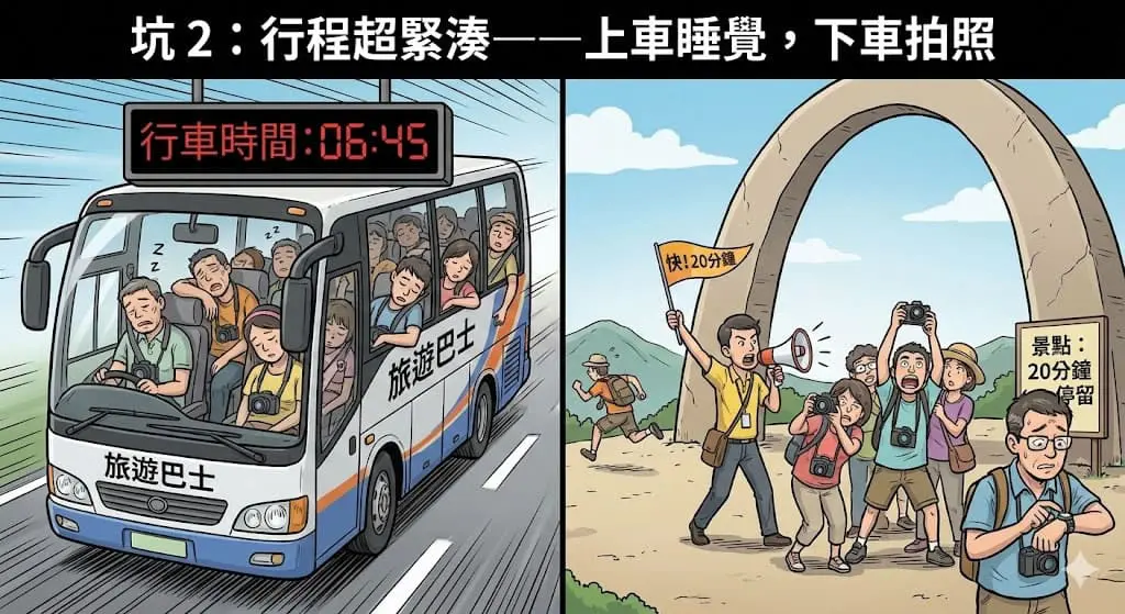 是的。為了塞入更多景點、更多購物點,你一天可能坐 3–8 小時車,下車只給 20–40 分鐘拍照,基本無法深入體驗。