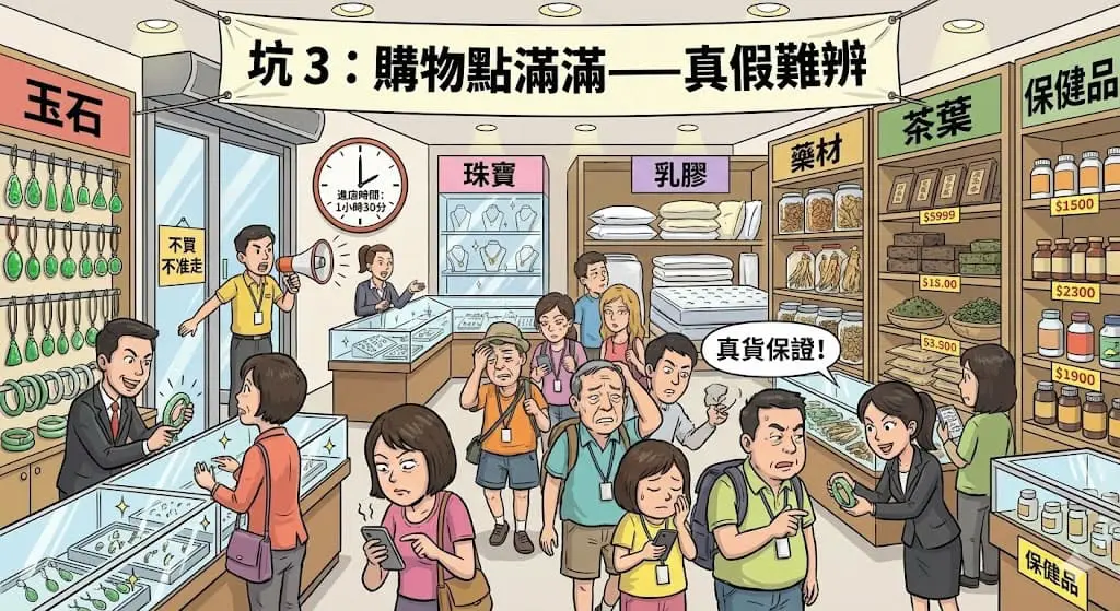 可以不買,但 不能不進店。而且購物店通常停留 60~120 分鐘,旅遊時間就被瓜分。商品真假難辨、價格虛高,是台灣旅客最痛苦的部分。