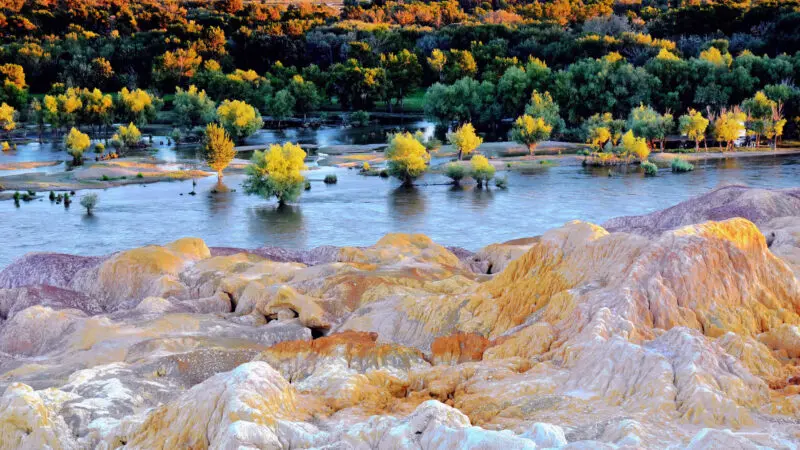 五彩灘位於布林津附近,是新疆著名的雅丹地貌景區。岩石經過長期風蝕與礦物沉積,呈現紅、黃、橙、紫等多種色彩,在陽光照射下色彩斑斕,因此被稱為「五彩灘」。額爾齊斯河從景區旁流過,河流與彩色岩石形成獨特壯麗的自然景觀。