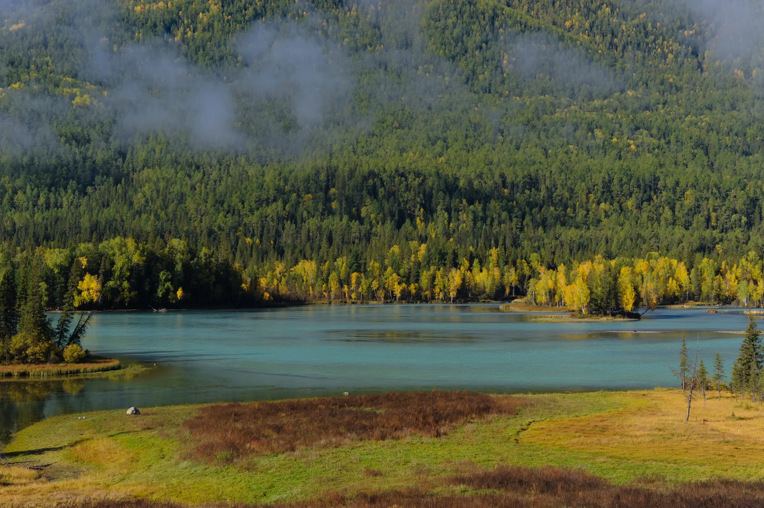 神仙灣位於喀納斯湖上游,是喀納斯景區最夢幻的景點之一。清晨時常出現薄霧,湖水與森林在晨光中若隱若現,宛如仙境,因此得名神仙灣。秋天時整片森林轉為金黃色,搭配靜謐湖水,景色極為迷人,是遊客與攝影師最喜愛的景點之一。