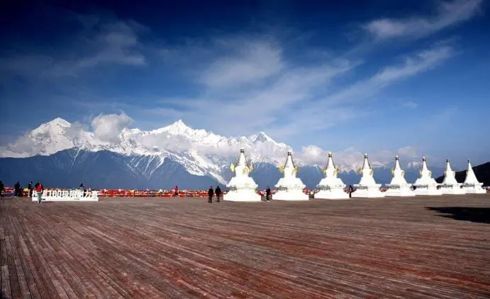 遠眺梅里雪山的絕佳地點,佛塔群與雪山相映成趣。