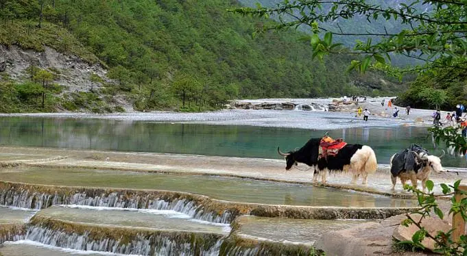 因河床、臺地都由白色大理石、石炭石碎塊組成,水流經過時呈現出白色,故而得名。河水清澈見底,與周邊的青山、綠樹相互映襯,構成了一幅美麗的山水畫卷。
