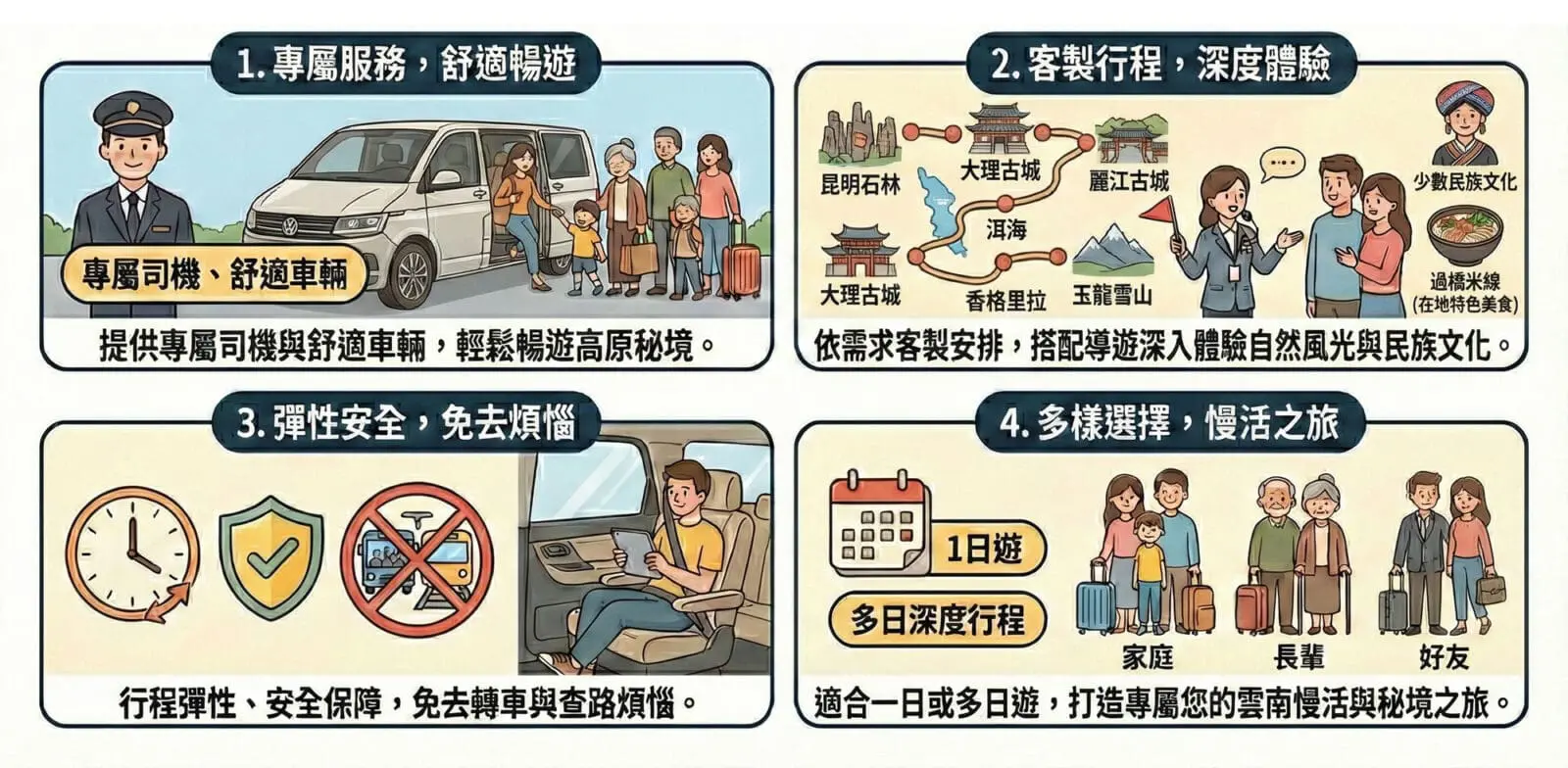 雲南包車旅遊提供專屬司機與舒適車輛,讓您輕鬆暢遊高原秘境與多元民族風情景點。無論是家庭出遊、長輩同行或好友結伴,我們皆可依需求客製化安排,並可搭配導遊服務,深入體驗雲南的自然風光、少數民族文化與在地特色美食。行程彈性、安全有保障,免去轉車與查路煩惱,適合一日遊或多日深度行程,輕鬆走訪昆明石林、大理古城、洱海環湖、麗江古城、玉龍雪山、香格里拉等必訪景點,打造專屬您的雲南慢活與秘境之旅。