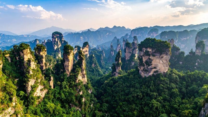 張家界國家森林公園為世界自然遺產,以奇峰林立的石英砂岩地貌聞名。群峰拔地而起,雲霧繚繞時宛如仙境,是電影《阿凡達》取景靈感來源。園區涵蓋袁家界、天子山等核心景區,是體驗張家界自然景觀精華的重點行程。