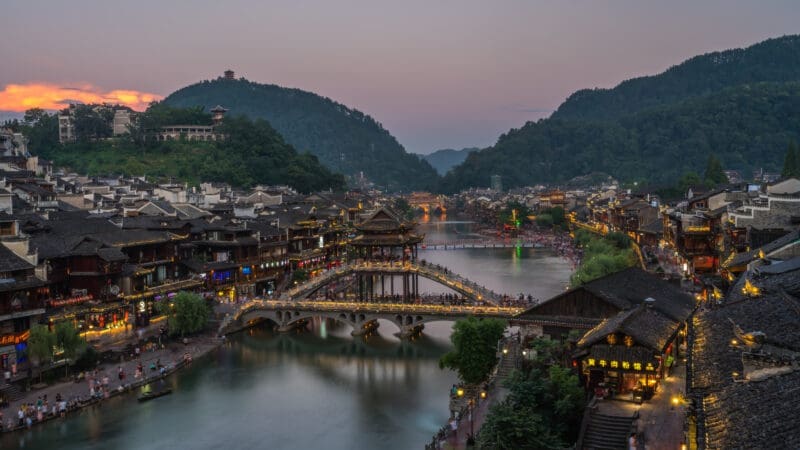 鳳凰古城位於湘西自治州,是融合苗族與土家族文化的千年古鎮。沿沱江而建的吊腳樓是古城最具代表性的景觀,白天古樸寧靜,夜晚燈火倒映江面格外迷人。漫步青石板街,可深刻感受湘西的人文與歷史氛圍。